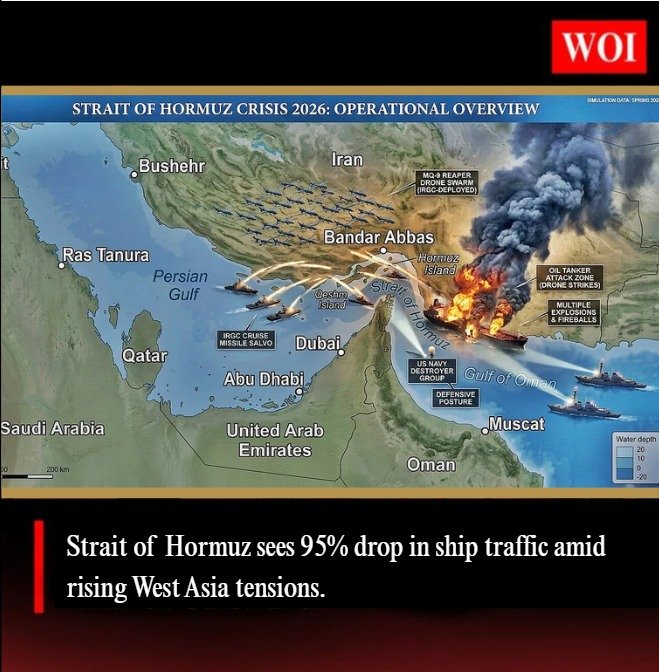The ongoing West Asia conflict has severely disrupted global shipping as vessel movement through the Strait of Hormuz has dropped by nearly 95% since early March 2026. This dramatic decline has raised major concerns over global energy supply, as the strait carries around 20% of the world’s oil trade. The crisis highlights the vulnerability of global supply chains to geopolitical tensions in critical regions.