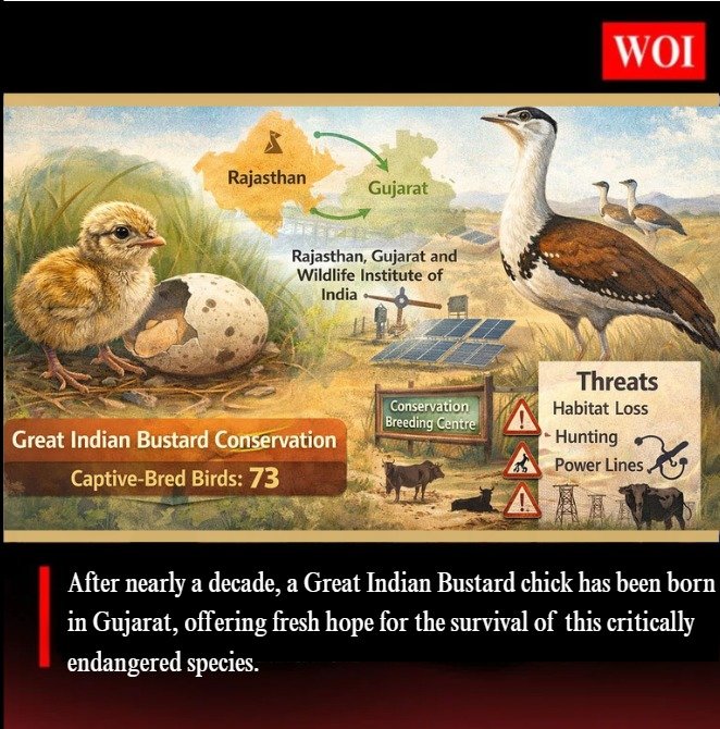 This successful hatching revives breeding potential in Gujarat, demonstrates effective inter-state cooperation, and offers a promising model for future conservation interventions. However, challenges such as habitat degradation, power line collisions, and the extremely small population continue to threaten the long-term survival of the Great Indian Bustard.
