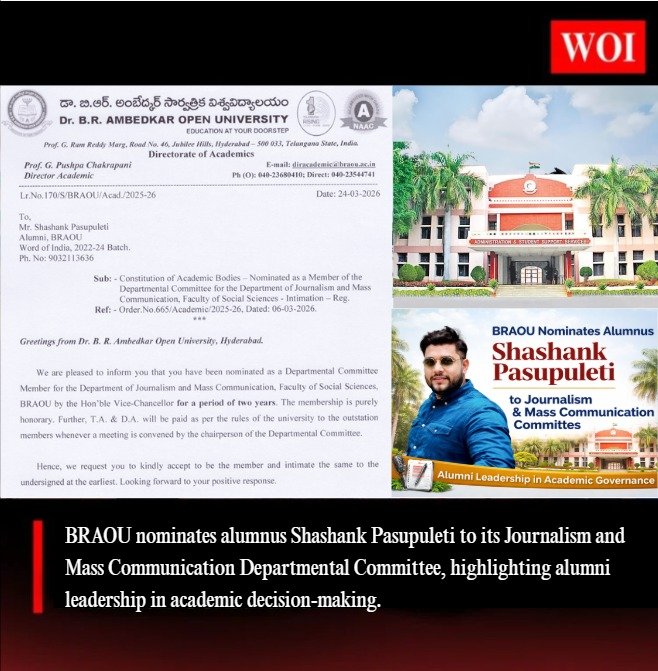 In a significant academic recognition, Dr. B.R. Ambedkar Open University (BRAOU), Hyderabad, has nominated Mr. Shashank Pasupuleti, alumnus of the university’s 2022–24 batch and founder of SK Group Connections, as a Member of the Departmental Committee for the Department of Journalism and Mass Communication under the Faculty of Social Sciences.