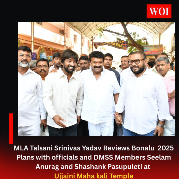 Secunderabad, June 21, 2025 — Preparations for Bonalu 2025 gained momentum today as the Deccan Manav Seva Samithi (DMSS) convened a high-level coordination meeting with Sanathnagar MLA and former minister Talsani Srinivas Yadav at the Shri Ujjaini Mahakali Temple. DMSS representatives Seelam Anurag and Shashank Pasupuleti joined the MLA for an on-ground inspection of the temple’s infrastructure and crowd control arrangements.