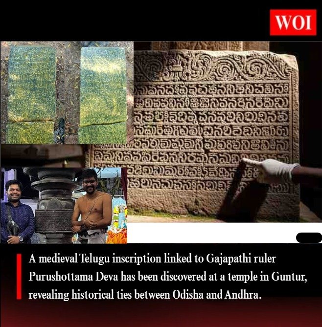 A medieval Telugu inscription associated with the Gajapathi Dynasty of Odisha has been discovered at the Lakshmi Narasimha Swamy Temple in Guntur, Andhra Pradesh. The inscription, engraved on a stone pillar inside the temple mandapa, provides new insights into the political and cultural connections between Odisha and coastal Andhra during the late medieval period.