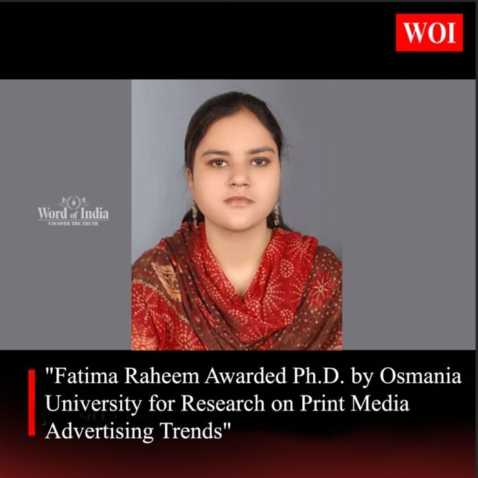 Guided by Prof. K. Nageshwar from the Department of Journalism and Mass Communication, Osmania University, Fatima’s research marks a significant contribution to the field of Communication and Journalism. Her study provides fresh insights into the evolving landscape of print media advertising, offering valuable conclusions for future research and industry practices.