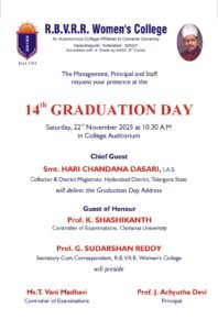 R.B.V.R.R Women’s College, Narayanaguda, Hyderabad, will hold its 14th Graduation Ceremony on 22nd November 2025, celebrating the achievements of 562 graduates from the 2020–2023 and 2021–2024 batches.