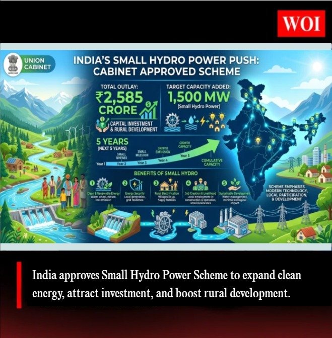 The Union Cabinet of India has approved the Small Hydro Power (SHP) Development Scheme for the period FY 2026–27 to FY 2030–31, with a total outlay of ₹2584.60 crore. The initiative aims to develop around 1500 MW of small hydro power capacity across India, with a strong focus on clean and decentralized energy.