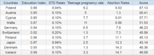 While Poland tops the list with a composite score of 67.1, it has one of the lowest STD rates and second-lowest abortion rates. Following closely is Austria proving that quality education directly correlates with low teenage pregnancy cases, STD, and abortion rates.